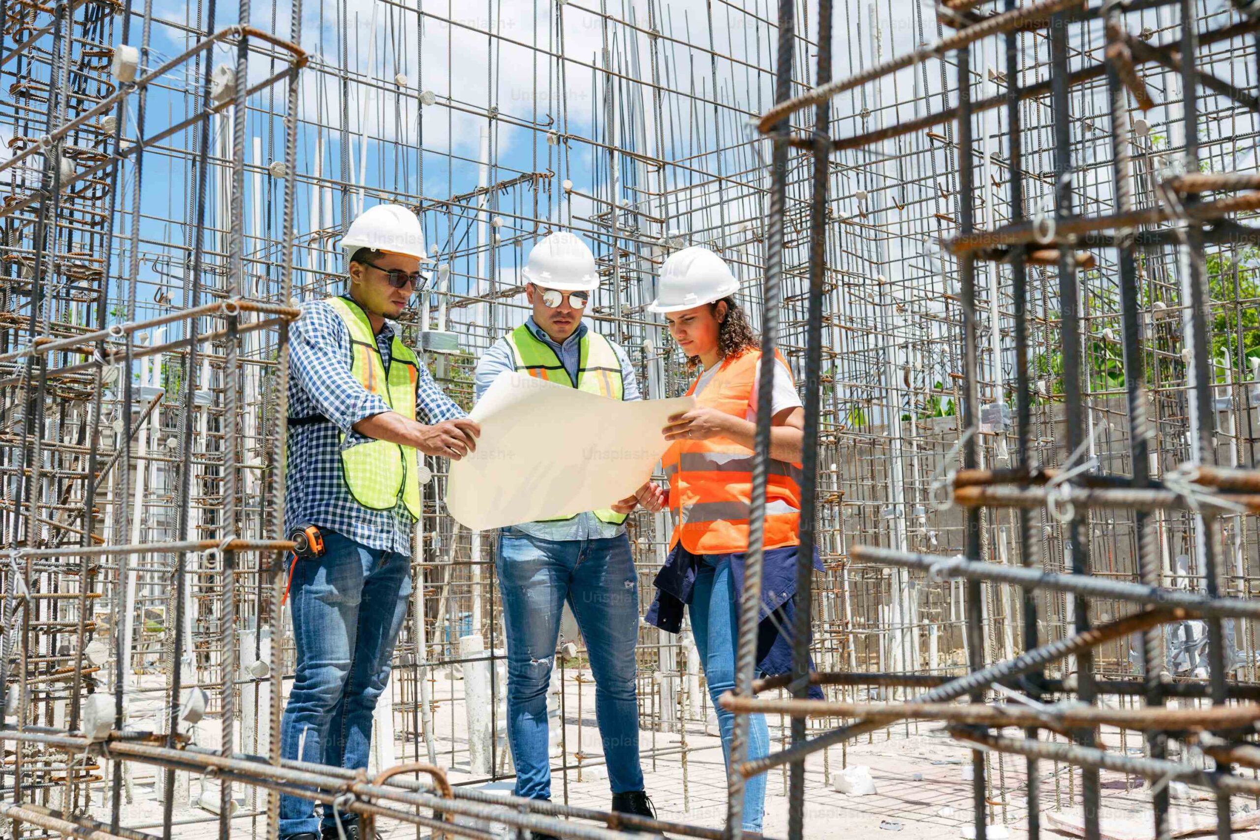 A professional scene with construction workers reviewing plans—perfect to represent skilled workforce and on-site supervision.